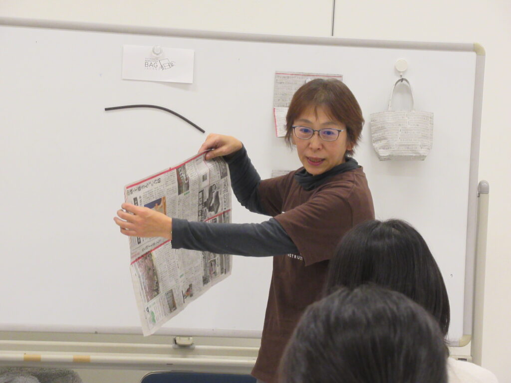 先着順で参加できるワークショップを2種実施する。別途、3Rの一例として、完成品の新聞ばっくも展示する。